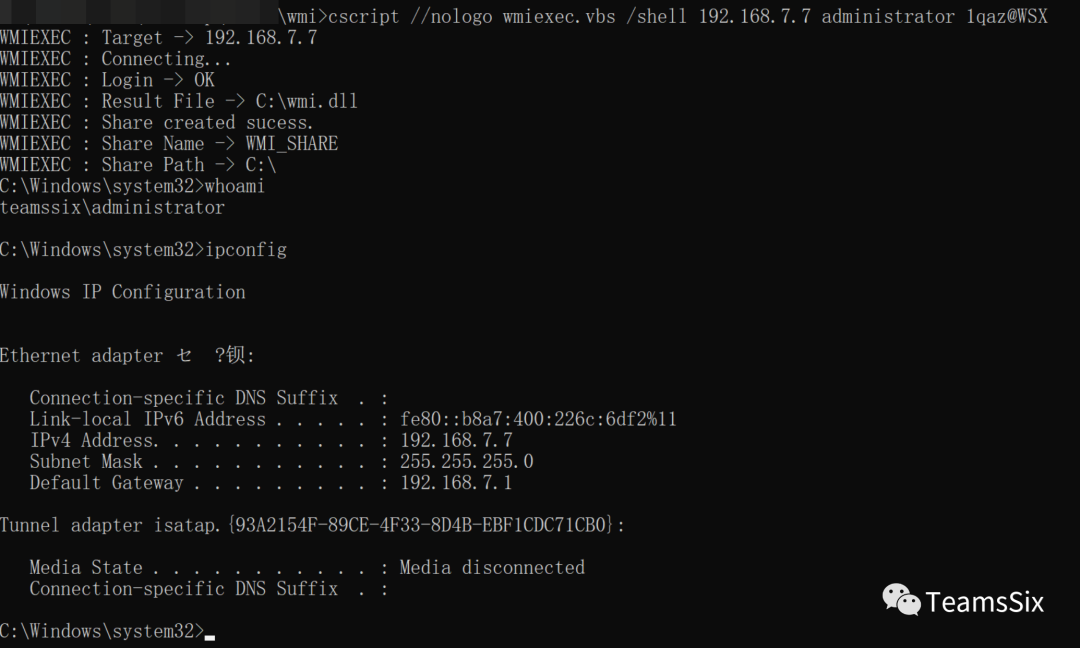 cscript wmiexec.vbs /cmd 192.168.7.7 administrator 1qaz@WSX "ipconfig"