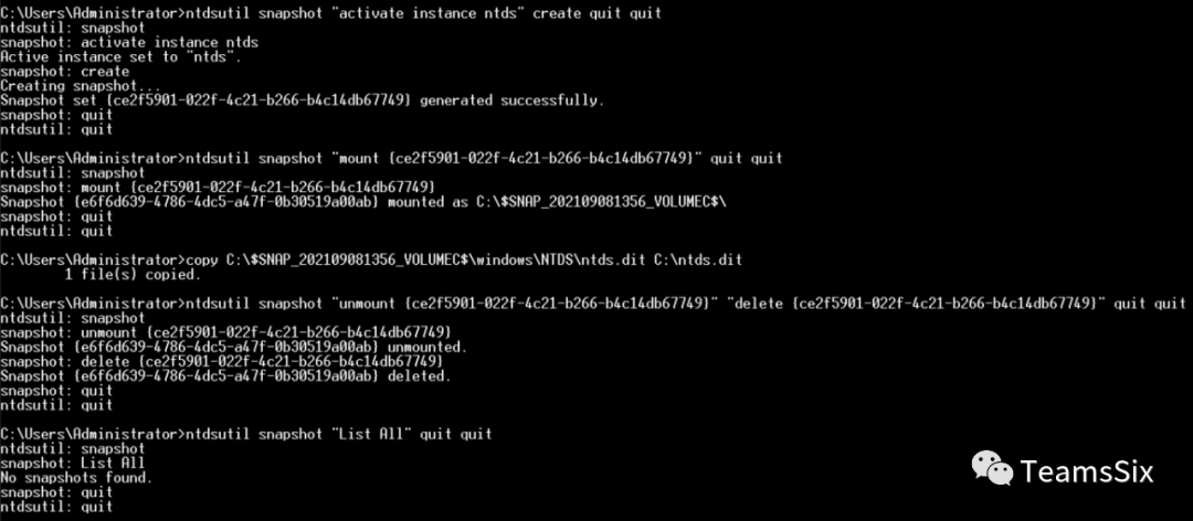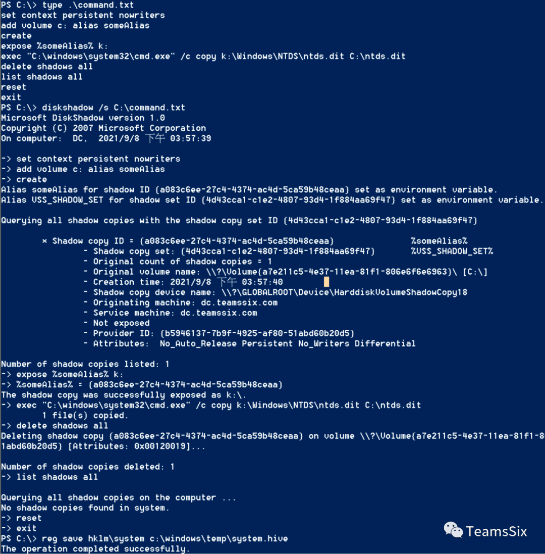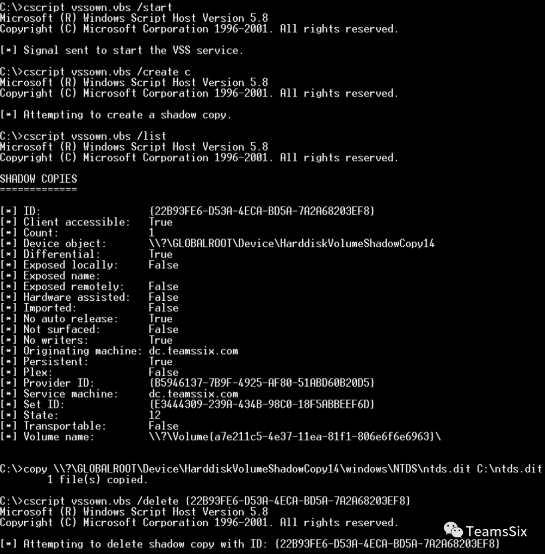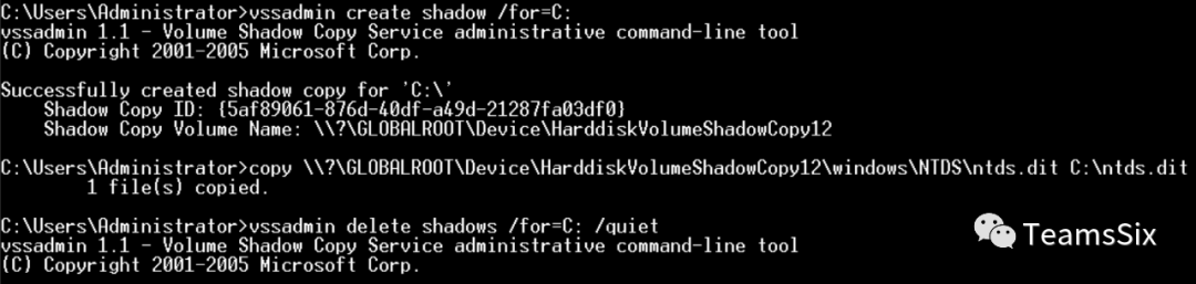 该工具默认安装在域控上,使用以下命令创建一个快照,该快照包含 Windows 中的所有文件,且在复制文件时不会受到 Windows 锁定机制的限制。