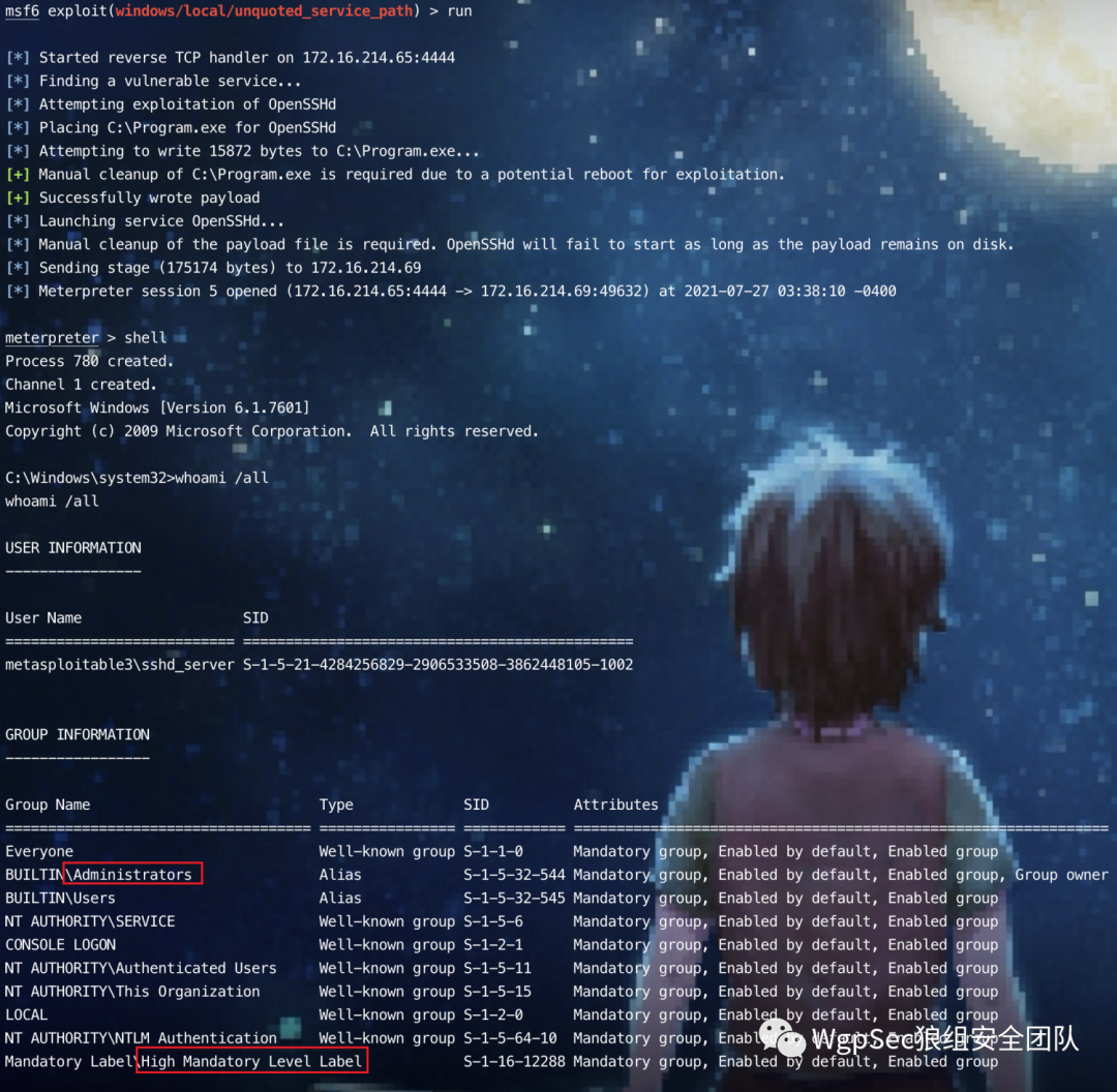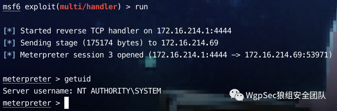 同时如果此时程序以 SYSTEM 运行,那我们就将获得一个 SYSTEM 权限的会话。