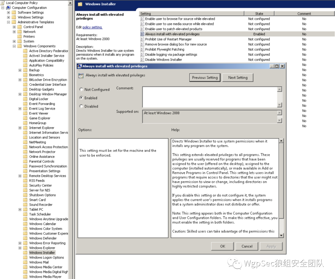 产生该漏洞的原因是由于用户在策略编辑器中开启了 Windows Installer 特权安装功能。