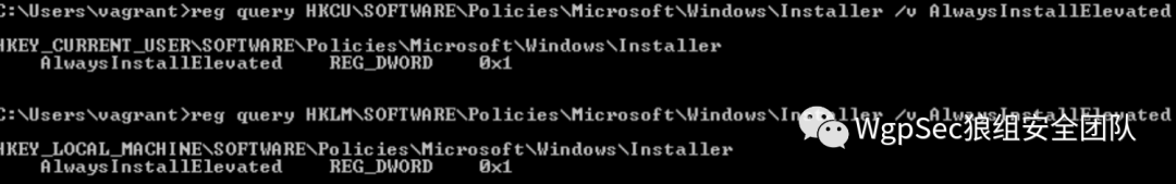 reg query HKCU\SOFTWARE\Policies\Microsoft\Windows\Installer /v AlwaysInstallElevatedreg query HKLM\SOFTWARE\Policies\Microsoft\Windows\Installer /v AlwaysInstallElevated