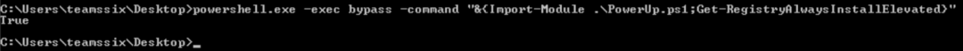 powershell.exe -exec bypass -command "&{Import-Module .\PowerUp.ps1;Get-RegistryAlwaysInstallElevated}"