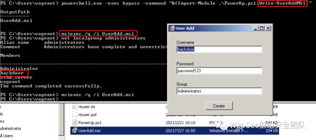 运行完后,会在当前目录下生成一个 UserAdd.msi 程序,此时以普通用户权限执行该 MSI 程序就会创建一个管理员账户。