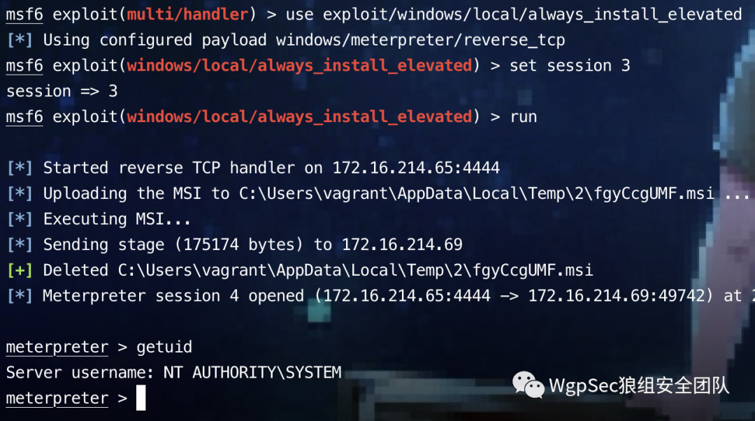 MSF 中可以使用 exploit/windows/local/always_install_elevated 模块,直接获取 SYSTEM 权限。
