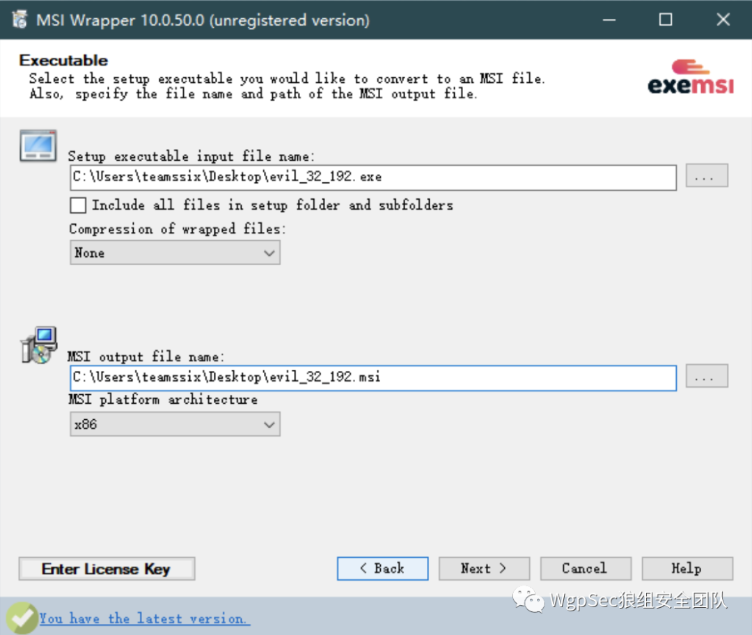 选择自己要导入的 EXE 木马文件位置和导出 MSI 安装包位置。