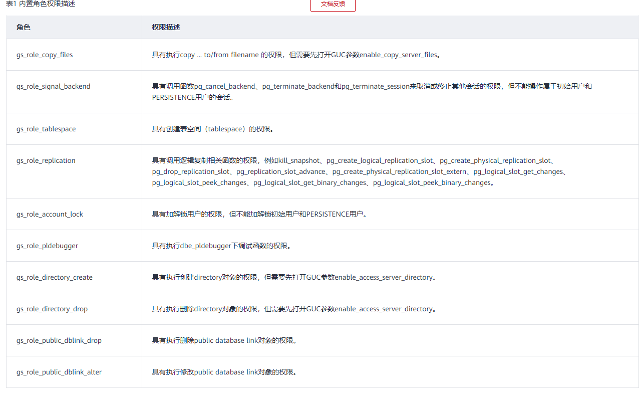 - 以gs_role_开头的角色名作为数据库的内置角色保留名,禁止新建以“gs_role_”开头的用户/角色/模式,也禁止将已有的用户/角色/模式重命名为以“gs_role_”开头;