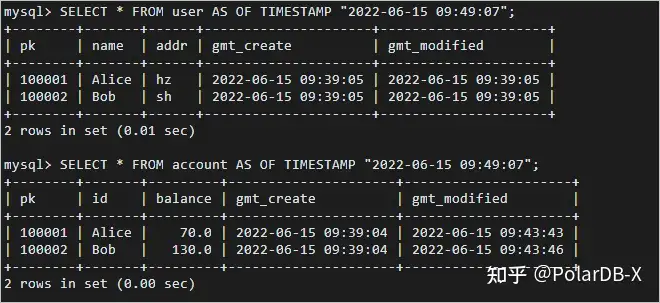 SELECT a.id, a.balance, b.addr FROM account a JOIN user AS OF TIMESTAMP "{ts0}" b ON a.id = b.name;