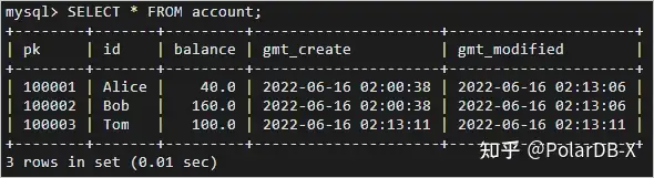 mysql -h127.0.0.1 -P3306 -upolardbx_root transfer_testc. 按照如下表格中的步骤顺序,在终端三和终端四中分别执行如下SQL语句,进行转账测试。