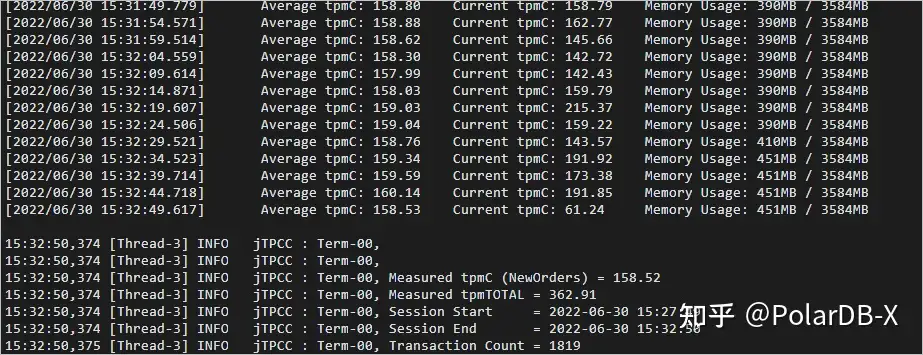 ./runBenchmark.sh props.mysql返回结果如下,运行TPC-C测试后可以您看到实时的tpmC数值。请您耐心等待2分钟后,运行结束后会显示平均的tpmC数值。