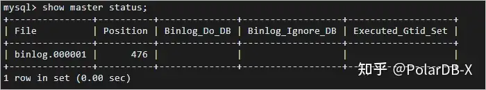 show master status;返回结果如下,您可查看到源库的binlog File和binlog Position。