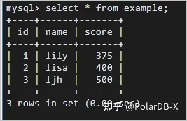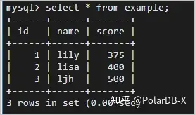 insert into example values(null,'lily',375),(null,'lisa',400),(null,'ljh',500);e.执行如下命令,查看数据。