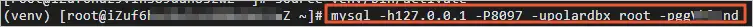 f.切换至终端二,执行PolarDB-X安装完成后输出的的连接方式,登录PolarDB-X。例如mysql -h127.0.0.1 -P7148 -upolardbx_root -pXXXXXX。