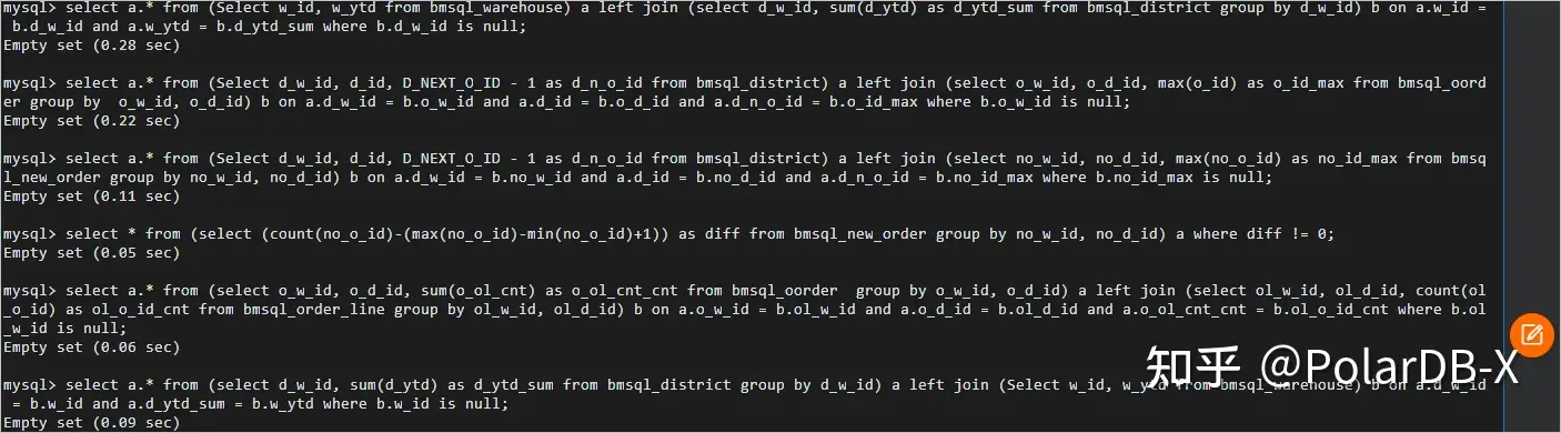 select a.* from (select d_w_id, sum(d_ytd) as d_ytd_sum from bmsql_district group by d_w_id) a left join (Select w_id, w_ytd from bmsql_warehouse) b on a.d_w_id = b.w_id and a.d_ytd_sum = b.w_ytd where b.w_id is null;返回结果如下,若结果集均为空,则证明压测数据完整。
