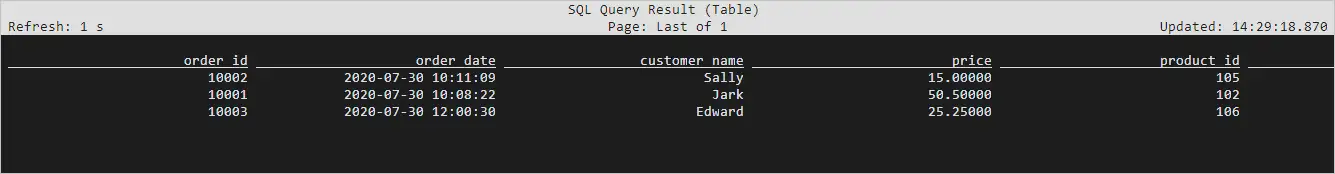CREATE TABLE orders ( order_id INT, order_date TIMESTAMP(0), customer_name STRING, price DECIMAL(10, 5), product_id INT, order_status BOOLEAN, PRIMARY KEY (order_id) NOT ENFORCED ) WITH ( 'connector' = 'mysql-cdc', 'hostname' = 'localhost', 'port' = '8527', 'username' = 'polardbx_root', 'password' = '123456', 'database-name' = 'mydb', 'table-name' = 'orders' );b.执行如下SQL语句,查看订单表orders。