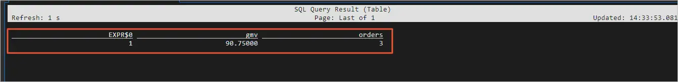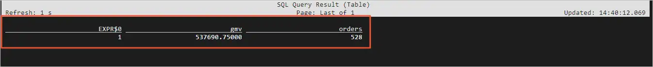 切换至终端一,在Flink中执行如下SQL语句,查询GMV(gmv列)和订单数(orders列)。