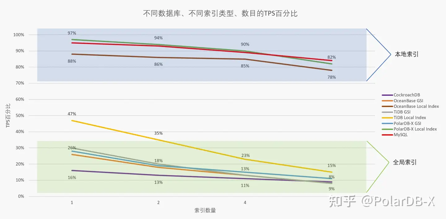 我们可以看到,这些分布式数据库实现的全局索引中,即使只有1个索引,性能也都会下跌到30%以下,在8个索引的情况下,性能基本都会跌倒10%以下。