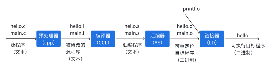 生成可执行文件:将所有的汇编代码和库组合成一个可执行文件。