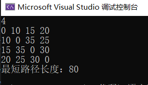 #include <iostream>#include <vector>#include <algorithm>#include <limits>using namespace std;const int INF = numeric_limits<int>::max();int tsp(vector<vector<int>>& graph, vector<bool>& visited, int current, int n, int count, int cost, int& ans) {if (count == n && graph[current][0] != 0) {ans = min(ans, cost + graph[current][0]);return ans;}for (int i = 0; i < n; ++i) {if (!visited[i] && graph[current][i] != 0) {visited[i] = true;tsp(graph, visited, i, n, count + 1, cost + graph[current][i], ans);visited[i] = false;}}return ans;}int main() {int n; // 城市数量cin >> n;vector<vector<int>> graph(n, vector<int>(n));// 输入城市间的距离for (int i = 0; i < n; ++i) {for (int j = 0; j < n; ++j) {cin >> graph[i][j];}}vector<bool> visited(n, false);visited[0] = true; // 从第一个城市开始int ans = INF;int result = tsp(graph, visited, 0, n, 1, 0, ans);cout << "最短路径长度:" << result << endl;return 0;}