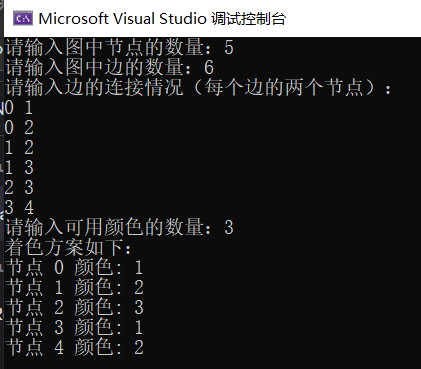 ,然后继续递归地处理下一个节点。如果没有找到有效的颜色,就回溯到前一个节点,并尝试其他颜色,直到找到解决方案或确定没有解决方案。回溯和搜索:使用回溯的方式来搜索可能的解决方案。从第一个节点开始,尝试为其分配颜色,并继续到下一个节点,直到所有节点都被着色。如果在某个节点无法找到合适的颜色,就回溯到上一个节点,尝试其他颜色。通过不断的回溯和尝试,直到找到一个有效的着色方案或确定没有解。 输出结果:一旦找到有效的着色方案,即所有节点都被分配了颜色,就输出这个着色方案,显示每个节点的颜色。 可行性检查:在颜色分配的过程中,需要检查每个节点的颜色是否与相邻节点的颜色冲突。这可以通过检查领接矩阵来实现,确保相邻节点没有相同的颜色。 用户输入:用户需要提供图的描述,包括节点数量、边的连接情况和可用的颜色数量。这些信息将用于构建图和设置问题的参数。