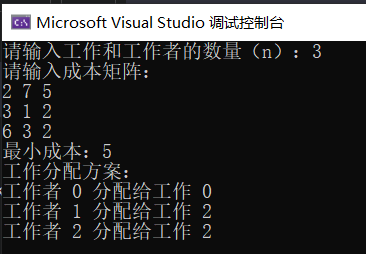 #include <iostream>#include <vector>#include <limits>using namespace std;const int MAX_N = 10; // 最大工作和工作者数量int n; // 工作和工作者的数量int cost[MAX_N][MAX_N]; // 成本矩阵int assignment[MAX_N]; // 存储分配方案bool assigned[MAX_N]; // 记录工作是否已经被分配int minCost = numeric_limits<int>::max(); // 最小成本void backtrack(int worker, int currentCost) {if (worker == n) {// 所有工作都已经分配完,更新最小成本minCost = min(minCost, currentCost);return;}for (int job = 0; job < n; ++job) {if (!assigned[job]) {// 如果工作未分配给工作者if (currentCost + cost[worker][job] < minCost) {// 可行性剪枝:只有当前成本小于最小成本才继续assigned[job] = true;assignment[worker] = job;backtrack(worker + 1, currentCost + cost[worker][job]);assigned[job] = false;}}}}int main() {cout << "请输入工作和工作者的数量(n):";cin >> n;cout << "请输入成本矩阵:" << endl;for (int i = 0; i < n; ++i) {for (int j = 0; j < n; ++j) {cin >> cost[i][j];}}// 初始化minCost = numeric_limits<int>::max();for (int i = 0; i < n; ++i) {assigned[i] = false;}backtrack(0, 0);cout << "最小成本:" << minCost << endl;cout << "工作分配方案:" << endl;for (int i = 0; i < n; ++i) {cout << "工作者 " << i << " 分配给工作 " << assignment[i] << endl;}return 0;}