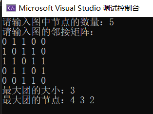 #include <iostream>#include <vector>#include <queue>using namespace std;const int MAX_NODES = 100;// 定义节点结构struct Node {vector<int> clique; // 当前子集中的节点vector<int> candidates; // 剩余可添加的候选节点Node(const vector<int>& c, const vector<int>& cand) : clique(c), candidates(cand) {}};bool isClique(const vector<vector<int>>& graph, const vector<int>& nodes) {for (int i = 0; i < nodes.size(); ++i) {for (int j = i + 1; j < nodes.size(); ++j) {if (graph[nodes[i]][nodes[j]] == 0) {return false; // 存在不相连的节点,不是团}}}return true; // 所有节点两两相连,是团}pair<int, vector<int>> findMaximumClique(const vector<vector<int>>& graph) {int n = graph.size();vector<int> initialClique;vector<int> initialCandidates;for (int i = 0; i < n; ++i) {initialCandidates.push_back(i);}Node initialNode(initialClique, initialCandidates);int maxSize = 0;vector<int> maxClique;queue<Node> q;q.push(initialNode);while (!q.empty()) {Node node = q.front();q.pop();if (node.clique.size() > maxSize) {maxSize = node.clique.size();maxClique = node.clique;}if (!node.candidates.empty()) {int nextNode = node.candidates.back();node.candidates.pop_back();vector<int> newClique = node.clique;newClique.push_back(nextNode);// 检查新子集是否仍然是团if (isClique(graph, newClique)) {vector<int> newCandidates;for (int candidate : node.candidates) {if (graph[nextNode][candidate] == 1) {newCandidates.push_back(candidate);}}Node newNode(newClique, newCandidates);q.push(newNode);}}}return make_pair(maxSize, maxClique);}int main() {int n;cout << "请输入图中节点的数量:";cin >> n;vector<vector<int>> graph(n, vector<int>(n, 0));cout << "请输入图的邻接矩阵:" << endl;for (int i = 0; i < n; ++i) {for (int j = 0; j < n; ++j) {cin >> graph[i][j];}}pair<int, vector<int>> result = findMaximumClique(graph);cout << "最大团的大小:" << result.first << endl;cout << "最大团的节点:";for (int node : result.second) {cout << node << " ";}cout << endl;return 0;}