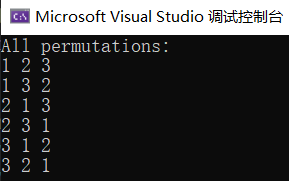 #include <iostream>#include <vector>using namespace std;void backtrack(vector<int>& nums, vector<vector<int>>& result, vector<int>& current, vector<bool>& used) {if (current.size() == nums.size()) {result.push_back(current);return;}for (int i = 0; i < nums.size(); ++i) {if (!used[i]) {current.push_back(nums[i]);used[i] = true;backtrack(nums, result, current, used);used[i] = false;current.pop_back();}}}vector<vector<int>> generatePermutations(vector<int>& nums) {vector<vector<int>> result;vector<int> current;vector<bool> used(nums.size(), false);backtrack(nums, result, current, used);return result;}int main() {vector<int> nums = {1, 2, 3};vector<vector<int>> permutations = generatePermutations(nums);cout << "All permutations:" << endl;for (const vector<int>& perm : permutations) {for (int num : perm) {cout << num << " ";}cout << endl;}return 0;}