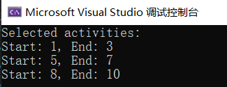 #include <iostream>#include <vector>#include <algorithm>using namespace std;struct Activity {int start;int end;};bool compareActivities(const Activity& a, const Activity& b) {return a.end < b.end;}vector<Activity> scheduleActivities(vector<Activity>& activities) {vector<Activity> selectedActivities;// 对活动按结束时间进行排序sort(activities.begin(), activities.end(), compareActivities);// 添加第一个活动到已选择列表selectedActivities.push_back(activities[0]);// 从第二个活动开始遍历for (int i = 1; i < activities.size(); ++i) {// 如果下一个活动的开始时间大于等于已选择活动的结束时间,则选择该活动if (activities[i].start >= selectedActivities.back().end) {selectedActivities.push_back(activities[i]);}}return selectedActivities;}int main() {vector<Activity> activities = {{1, 3},{2, 5},{3, 9},{6, 8},{5, 7},{8, 10}};vector<Activity> selectedActivities = scheduleActivities(activities);cout << "Selected activities:" << endl;for (const Activity& activity : selectedActivities) {cout << "Start: " << activity.start << ", End: " << activity.end << endl;}return 0;}