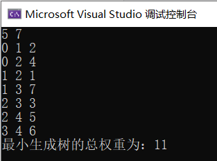 #include <iostream>#include <vector>#include <queue>#include <climits>using namespace std;const int INF = INT_MAX; // 无穷大// 定义带权无向图的邻接矩阵表示vector<vector<int>> graph;int prim(int n) {vector<int> dist(n, INF); // 存储节点到最小生成树的最短距离vector<bool> inMST(n, false); // 标记节点是否已包含在最小生成树中int minCost = 0; // 最小生成树的总权重// 从第一个节点开始构建最小生成树dist[0] = 0;for (int i = 0; i < n; ++i) {int u = -1;// 选择距离最小生成树最近的节点for (int j = 0; j < n; ++j) {if (!inMST[j] && (u == -1 || dist[j] < dist[u])) {u = j;}}if (dist[u] == INF) {// 无法找到新的节点,说明图不连通return -1;}inMST[u] = true;minCost += dist[u];// 更新与新节点相邻的节点的距离for (int v = 0; v < n; ++v) {if (!inMST[v] && graph[u][v] < dist[v]) {dist[v] = graph[u][v];}}}return minCost;}int main() {int n, m; // 节点数和边数cin >> n >> m;// 初始化图的邻接矩阵graph.assign(n, vector<int>(n, INF));for (int i = 0; i < m; ++i) {int u, v, w; // 边的两个节点和权重cin >> u >> v >> w;// 无向图,更新两个方向的边权graph[u][v] = graph[v][u] = w;}int minCost = prim(n);if (minCost == -1) {cout << "图不连通,无法构建最小生成树" << endl;} else {cout << "最小生成树的总权重为:" << minCost << endl;}return 0;}