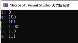 #include <iostream>#include <queue>#include <vector>#include <string>#include <unordered_map>using namespace std;// 定义哈夫曼树节点struct HuffmanNode {char data;int freq;HuffmanNode* left;HuffmanNode* right;HuffmanNode(char d, int f) : data(d), freq(f), left(nullptr), right(nullptr) {}};// 自定义优先队列比较器struct CompareNodes {bool operator()(HuffmanNode* a, HuffmanNode* b) {return a->freq > b->freq;}};// 生成哈夫曼树HuffmanNode* buildHuffmanTree(const unordered_map<char, int>& freqMap) {priority_queue<HuffmanNode*, vector<HuffmanNode*>, CompareNodes> minHeap;// 创建叶节点并将其插入优先队列for (const auto& pair : freqMap) {HuffmanNode* node = new HuffmanNode(pair.first, pair.second);minHeap.push(node);}// 构建哈夫曼树while (minHeap.size() > 1) {HuffmanNode* left = minHeap.top();minHeap.pop();HuffmanNode* right = minHeap.top();minHeap.pop();// 创建新节点,频率为左右子节点频率之和HuffmanNode* newNode = new HuffmanNode('\0', left->freq + right->freq);newNode->left = left;newNode->right = right;minHeap.push(newNode);}return minHeap.top(); // 返回哈夫曼树的根节点}// 生成字符的哈夫曼编码void generateHuffmanCodes(HuffmanNode* root, const string& code, unordered_map<char, string>& huffmanCodes) {if (root == nullptr) {return;}if (root->data != '\0') {huffmanCodes[root->data] = code;}generateHuffmanCodes(root->left, code + "0", huffmanCodes);generateHuffmanCodes(root->right, code + "1", huffmanCodes);}int main() {unordered_map<char, int> freqMap = {{'a', 5},{'b', 9},{'c', 12},{'d', 13},{'e', 16},{'f', 45}};HuffmanNode* root = buildHuffmanTree(freqMap);unordered_map<char, string> huffmanCodes;generateHuffmanCodes(root, "", huffmanCodes);// 输出字符及其哈夫曼编码for (const auto& pair : huffmanCodes) {cout << pair.first << ": " << pair.second << endl;}return 0;}