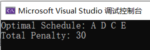 #include <iostream>#include <vector>#include <algorithm>using namespace std;// 定义任务结构体struct Task {char id; // 任务标识int deadline; // 截止时间int execution; // 执行时间};// 比较函数,用于排序任务bool compareTasks(const Task& task1, const Task& task2) {return task1.deadline < task2.deadline;}// 贪心算法解决任务调度问题void scheduleTasks(vector<Task>& tasks) {// 对任务按照截止时间进行排序sort(tasks.begin(), tasks.end(), compareTasks);int n = tasks.size(); // 任务数量vector<char> schedule; // 存储已安排的任务int totalPenalty = 0; // 总体惩罚int currentTime = 0; // 当前时间for (int i = 0; i < n; i++) {Task& currentTask = tasks[i];// 如果当前任务的截止时间小于等于当前时间,可以安排if (currentTask.deadline <= currentTime) {schedule.push_back(currentTask.id);totalPenalty += currentTime - currentTask.deadline;}currentTime += currentTask.execution;}// 输出任务调度顺序和总体惩罚cout << "Optimal Schedule: ";for (char id : schedule) {cout << id << " ";}cout << endl;cout << "Total Penalty: " << totalPenalty << endl;}int main() {vector<Task> tasks = {{'A', 2, 5},{'B', 1, 3},{'C', 4, 2},{'D', 2, 7},{'E', 5, 4}};scheduleTasks(tasks);return 0;}