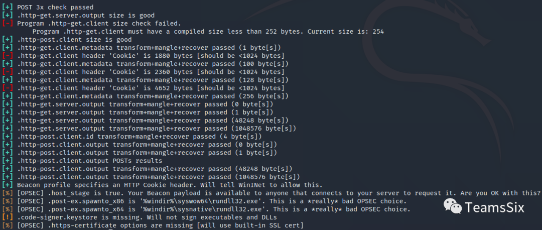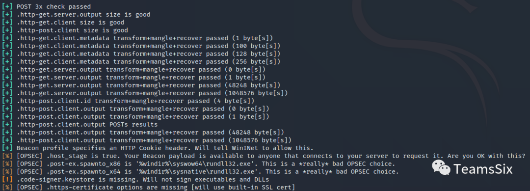 在运行的结果中,绿色正常(这里更像青色),黄色告警,红色错误,比如运行 Malleable-C2-Profiles