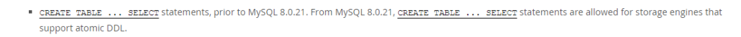 好消息是从 MySQL8.0.21 开始,支持原子 DDL 的存储引擎允许使用 CREATE TABLE ... SELECT ...