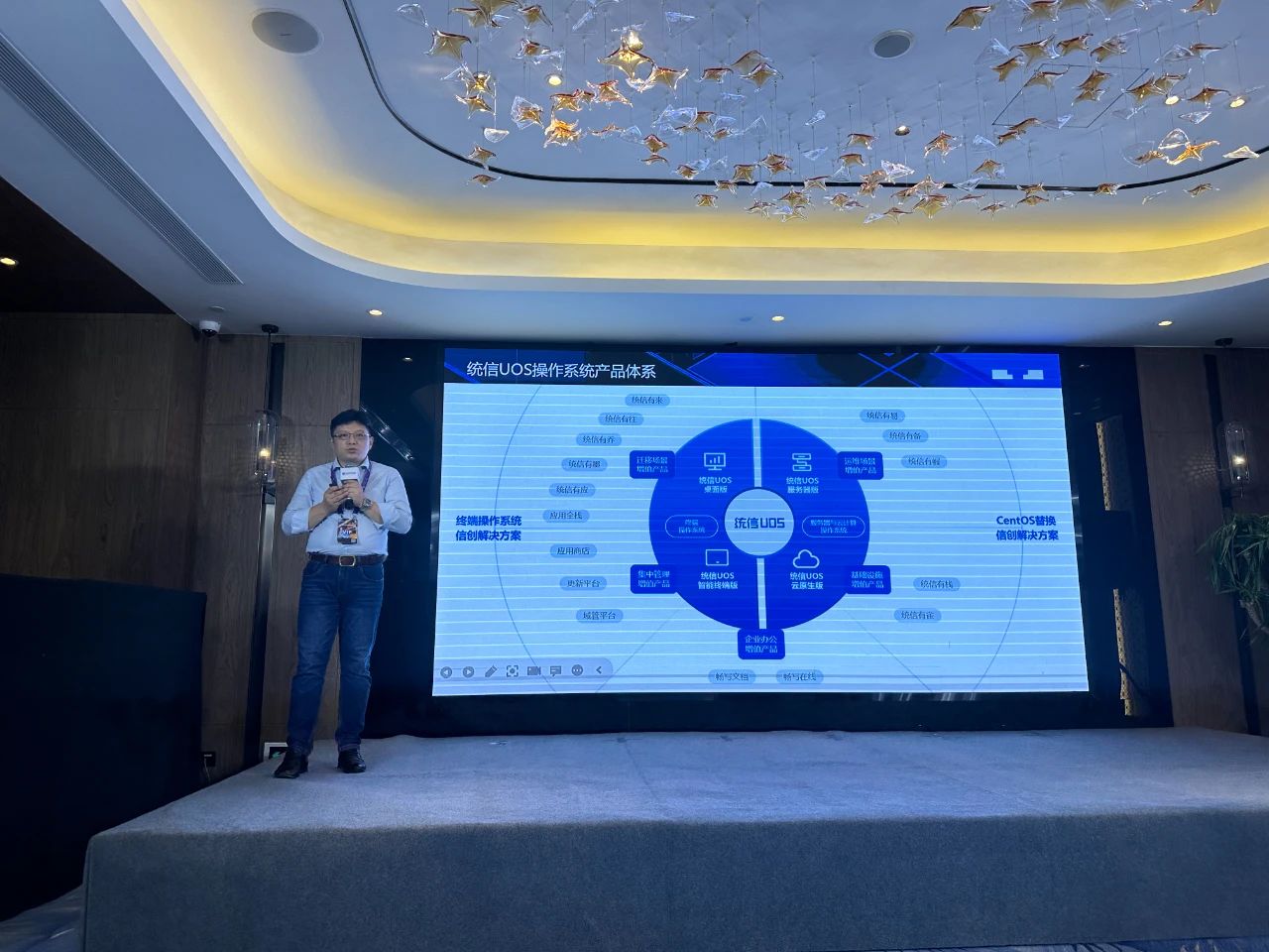 在主题演讲中,统信软件华东大区售前总监王艮分享了统信软件在工业智能制造方面的多项成果,从操作系统安全底座构建的角度,阐述国产操作系统在工业领域的重要作用,赢得现场专家学者和合作伙伴的一致好评。