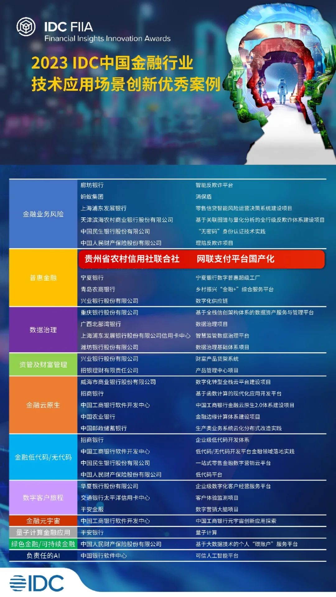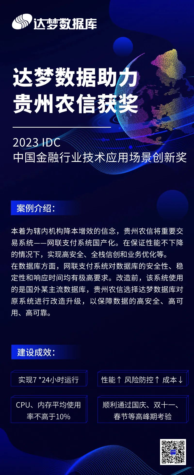 全球领先的IT市场研究与咨询公司IDC公布了 2023 IDC中国金融行业技术应用场景创新奖获奖名单,达梦数据支撑建设的贵州省农村信用社联合社-网联支付平台国产化摘得2023 IDC中国金融行业技术应用场景创新奖。