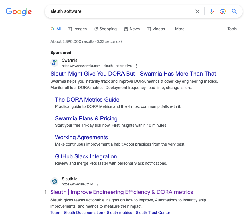 插曲,这家叫 swarmia 有点机智,知道新的 DORA 报告出了,会有人去搜赞助商,然后就投放了对应的关键词?