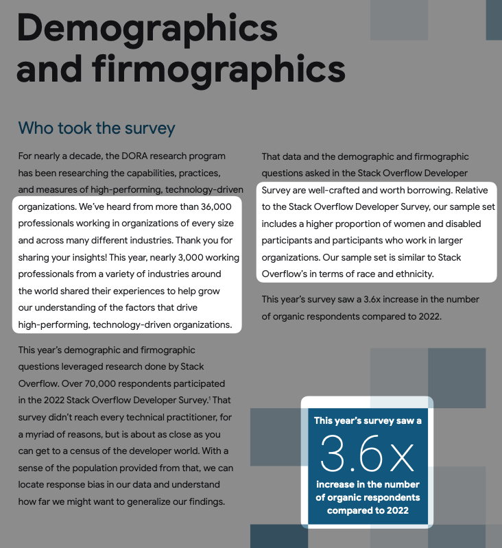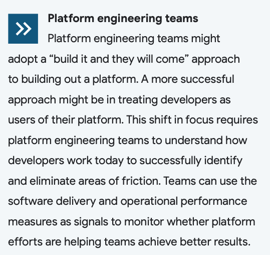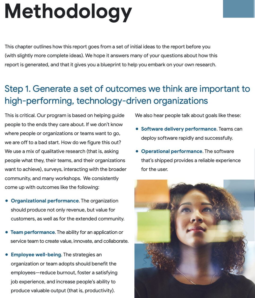 抛开内容本身,DORA 一如即往地给我们展示了如何撰写一份专业的行业报告。方法论,受访人群,分析方法都在报告中有清晰阐述。关注更多的声音,既让报告更加全面,也注入了人文的元素。I. 轻描淡写的平台工程