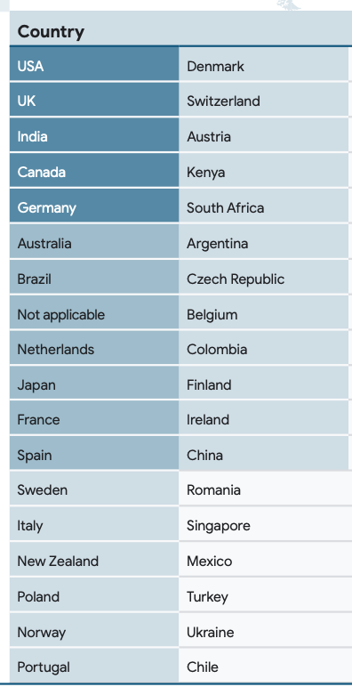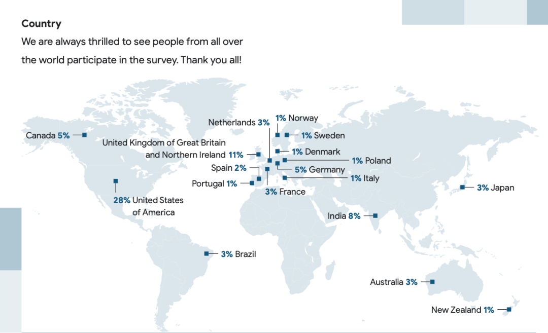 样本量相比去年增加了 3.6 倍,整个业界应该是仅次于 Stack Overflow Developer Survey 的规模。覆盖人群则更加全面。地域分布上,除去依然保持低调的某东方大国,也体现了各国软件业的相对体量。这个分布也可以作为出海软件公司的参考,用于选择进入一个新大陆的落脚点。看非洲,肯尼亚已经排在了南非之前。