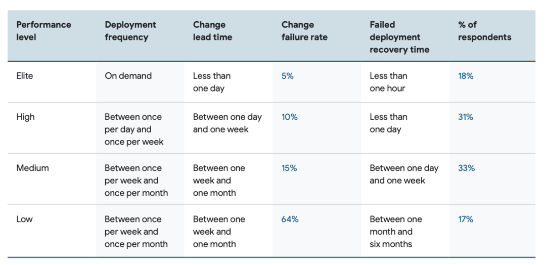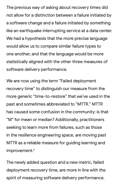 其中最后一个术语做了调整,之前报告用的是更加通用的术语 time-to-restore。因为通用,所以无法区分发布造成的故障和自然灾害造成的故障。新的术语更加精确地限定在了发布领域。