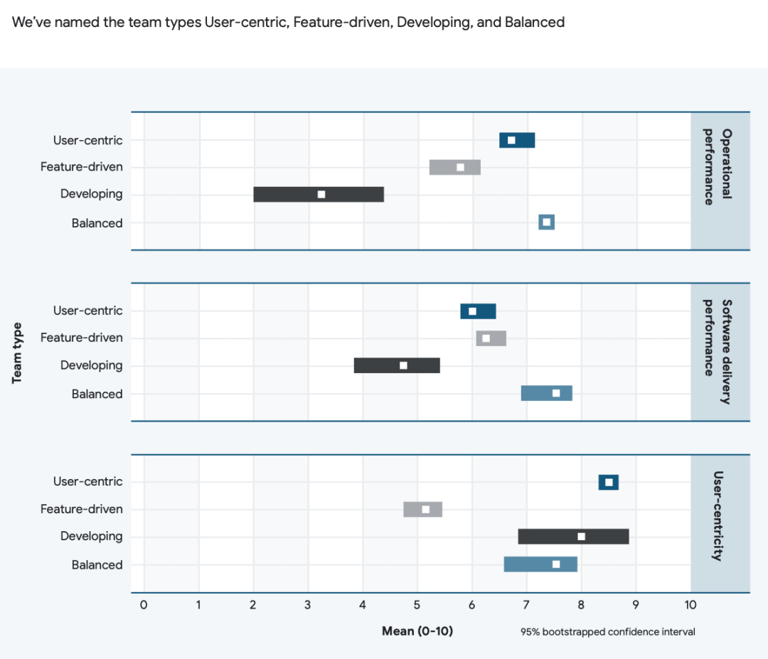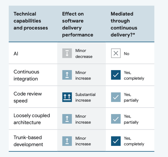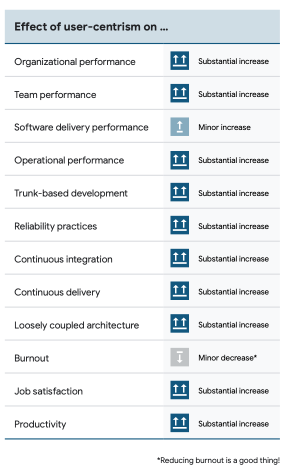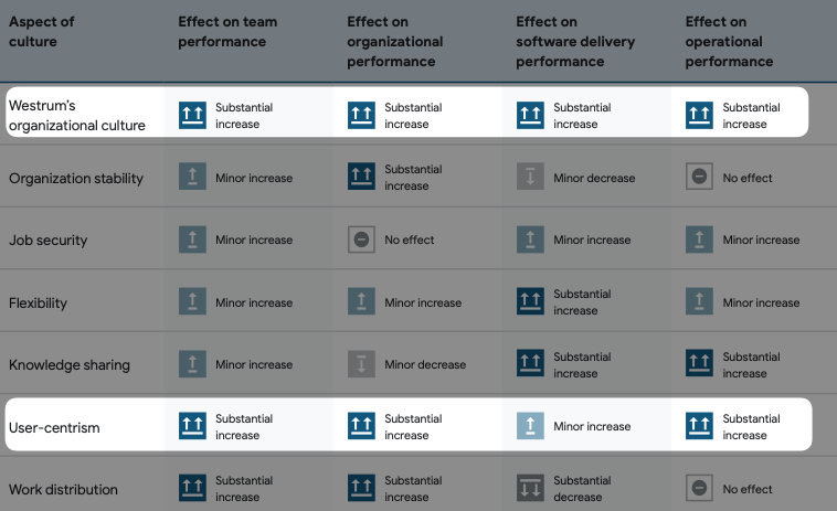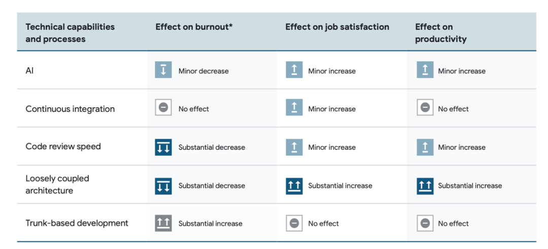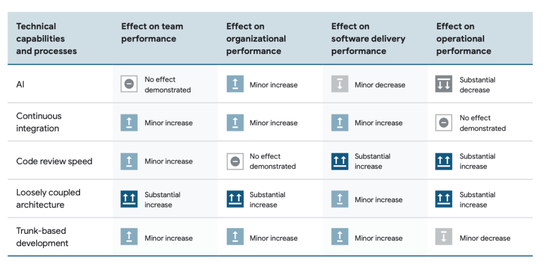 在所有评估的指标里,Westrum 文化和以用户为中心是最能带来正向效果的。前者大家可以进一步阅读 Westrum 的论文,而后者在 DORA 报告里还给出了进一步的数据。可以看到以用户为中心能给每一个指标都带来显著提升,自然现在的公司都要大力提倡了。影响表现的技术因素