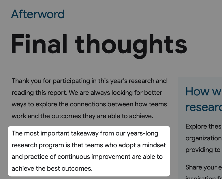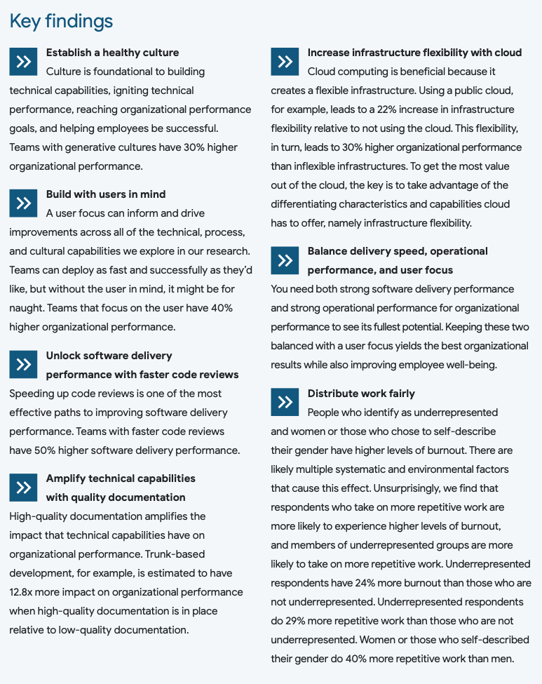 业界权威的年度报告里,Stack Overflow Developer Survey 偏一线,关注具体工作中所使用的产品技术;Gartner 面向管理层,关注行业的趋势。DORA 介于两者之间,DORA 里 DO 所代表的 DevOps 基因决定了报告的一线视角,RA 所代表的 Research & Assessment 又使得它会给出价值判断。而从这几年的报告趋势来看,DORA 正逐步走向管理层。比如从赞助商列表来看,往年都有不少研发链路某一个环节的工具厂商,像做 IDE 的 JetBrains,制品库的 JFrog,代码托管的 GitLab,应用部署的 Octopus,数据库变更的 Liquibase。而今年则是清一色的研发效能过程优化赞助商,或许这也是和报告背后的金主谷歌云面向大客的策略调整有关。再从正文看,今年的报告弱化了 DORA 一直背书的软件发布四大核心指标,而是更多地去叙述核心指标背后的元素。这其中把文化和以用户为中心放在了前两位。Culture eats strategy for breakfast - 彼得·德鲁克