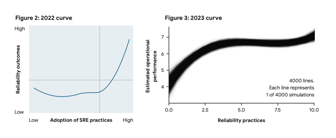 2022 年报告的数据显示,组织先要投入很长一段时间的稳定性建设,才能看到成果。这个结论多少让人沮丧,开始没有正向反馈就容易劝退。不过 2023 年通过优化问卷,得出了一个鼓舞人心的结论,就是稳定性和表现的关系符合 J 曲线,投入前期就有效果,然后再经过一段瓶劲期,最终再是显著的收益。