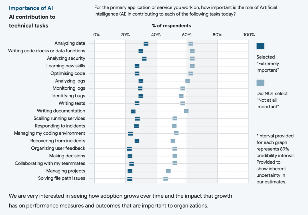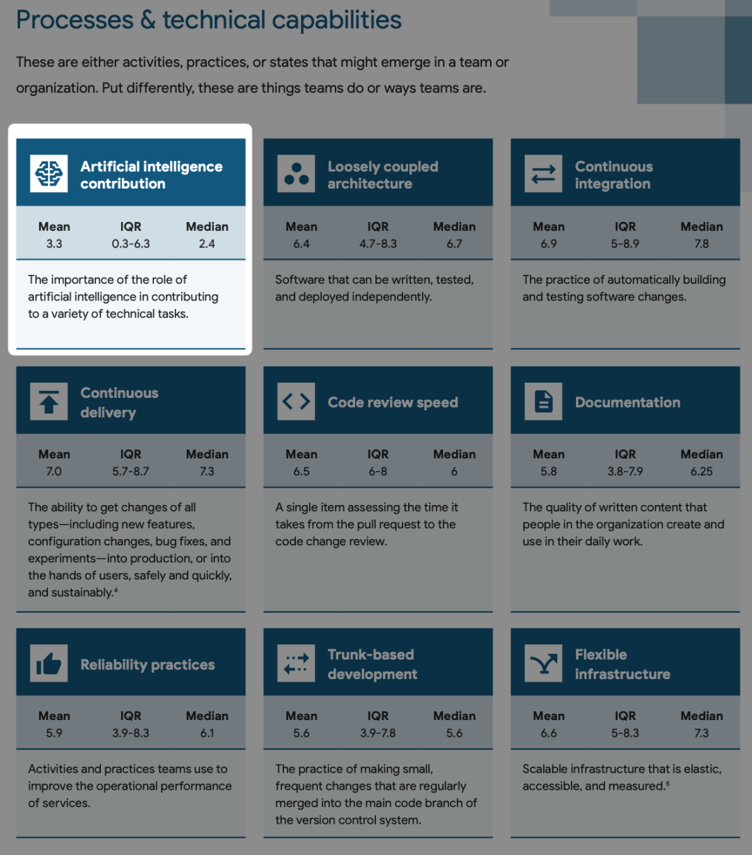 今年的报告自然不能忽视 AI,结论算是浇了一盆冷水,在所有技术影响因子里是以很大的差距垫底的。这倒也符合个人的预期,因为目前 AI 唯一破圈的场景是帮助写代码,属于「道法术器」里的「器」,是影响最小的。这幅图也比较有意思,展示了当下在研发交付领域,AI 擅长的和不擅长的。除了最后一个 Solving file path issue 是个有点奇怪的问题外,垫底的几个对应的都是「道法」层面的主要矛盾。
