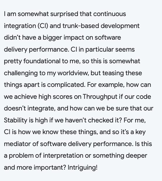 既然转型走高层的路线,那就要面临阵痛,DORA 团队分析复盘的能力很强,但相比 Gartner,缺少前瞻性。其本身又绑定在 DevOps 这个早已成熟的概念,再叠加上要宣传 SRE 这个也已经过了成长期的实践。对于平台工程,对于 AI,DORA 这次提及的不多,这一方面体现了它务实的部分,但这些未来 3 - 5 年可见的趋势,才是管理层们更关心的内容。