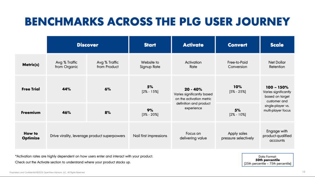 了解用户旅程在 PLG 框架中至关重要。OpenView 是一家专注扩张阶段企业的风险投资公司,在OpenView 2023 Product Benchmarks Report 中,他们将 PLG 模式下的用户旅程分为五大阶段,分别是 Discover 发现阶段、Start 开始阶段、Activate 激活阶段、Convert 转化阶段和 Scale 扩张阶段。