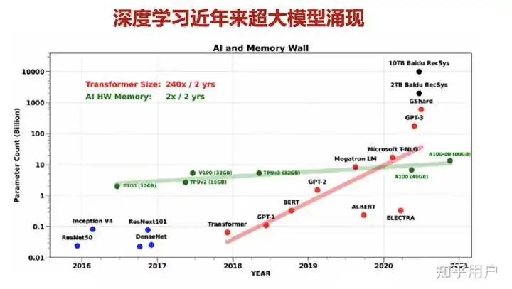 回到大模型,2017年 Transformer 结构的提出,使得深度学习模型参数突破了1亿。下面这个图呢,就是从一开始的 lenet、Alexnet、ResNet 开始,模型参数一个比一个大,到了 BERT 网络模型的提出,使得参数量首次超过3亿规模,GPT-3 模型超过百亿,鹏程盘古实现千亿稠密的规模、Switch Transformer 的问世还一举突破万亿规模。