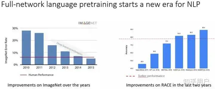 下面显示了深度学习技术在 ImageNet 图像数据集,随着新模型的提出,准确率不断取得突破的趋势。右图显示在网络预训练模型出来以后,机器对自然语言理解能力的不断提升。