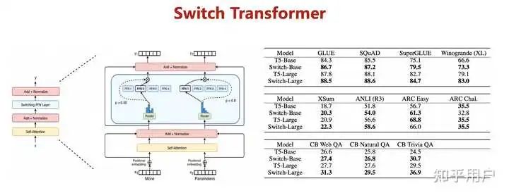 NLP 领域的大规模预训练模型可谓是发展快速,从 BERT 到 GPT-3,再到万亿规模的 Switch Transformer,无论是模型大小、数据量,还是计算资源占用都在疾速增长。规模大到什么程度呢?GPT-3 的参数量达到了 1750 亿,训练数据超过了 45TB,需要的算力 Flops 是 BERT 的 1900 多倍,3.14E23 FLOPS。在惊人的数据量和可怕的网络模型参数下,在实际 NLP 榜单 SuperGLUE,在该基准上 FLOP-matched Switch Transformer 相比 T5-Base 和 T5-Large 的性能分别提升了 4.4% 和 2%。整体而言,Switch Transformer 模型在多项推理和知识任务中带来了显著性能提升。这说明该超大模型架构不只对预训练有用,还可以通过微调将质量改进迁移至下游任务中。